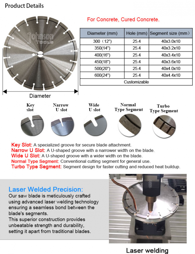 2. ข้อมูลจำเพาะของใบเลื่อยเทอร์โบเพชรขนาด 500 มม. สำหรับคอนกรีตที่บ่มแล้วพร้อมประสิทธิภาพที่ดี